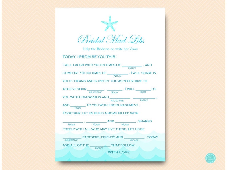 Beach Bridal Shower Games Wedding Vow Mad Libs Printable Bridal Shower Mad Libs Help Bride Write Her Vows Bridal Shower Mad Lib Bs28