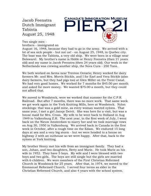 Dutch Immigrant Jacob Feenstra Pier 21