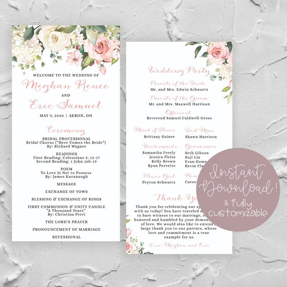 Green Blush White Wedding Program Neutral Floral Wedding Program Diy Wedding Program Downloadable Template Garden Wedding Program