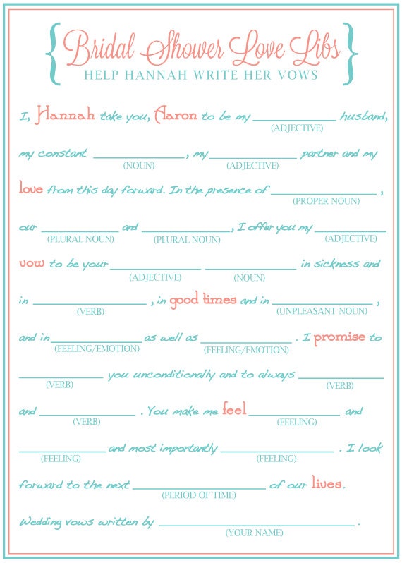 Bridal Shower Mad Libs Funny Shower Game Write Your Vows Game Love Libs Shower Game